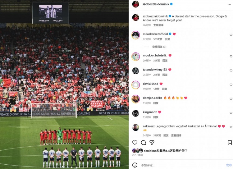 08月 16 2025 0 索博斯洛伊晒赛前双方默哀照:若塔&安德烈,我们永远不会忘记你 xiaoqiao 2025-08-16 法甲 181 7月14日讯 在友谊赛利物浦3-1击败普雷斯顿的比赛前,双方在中圈为若塔默哀。利物浦球员索博斯洛伊也在个人社媒晒出双方默哀的照片,配文写道:“季前赛一个不错的开始,若塔&安德烈,我们永远不会忘记你们。”